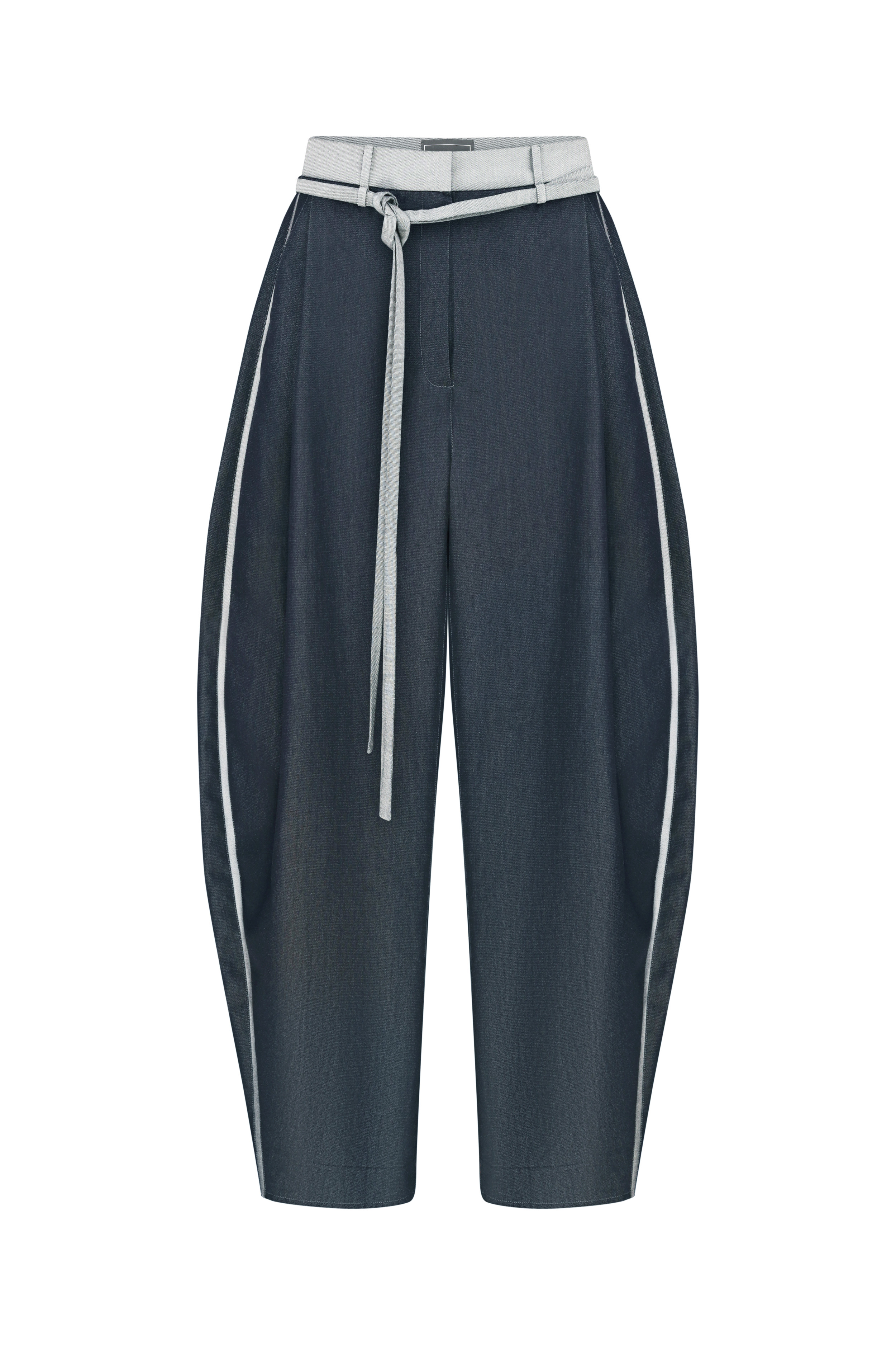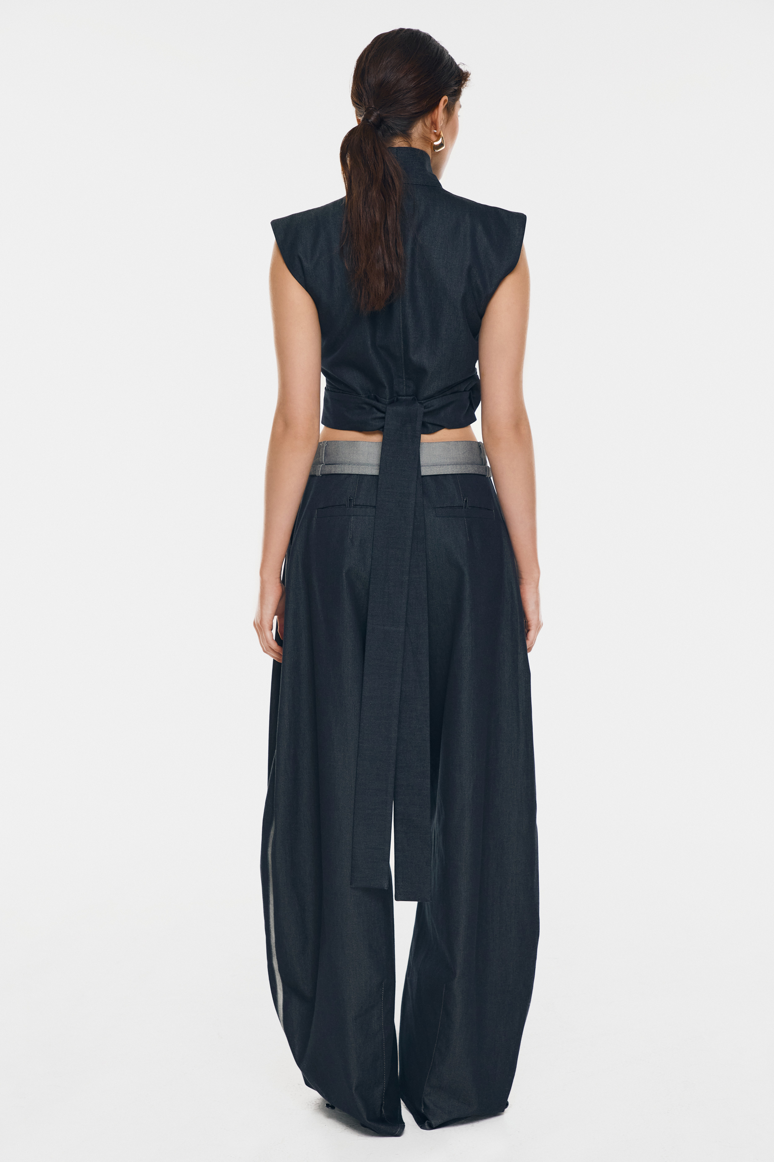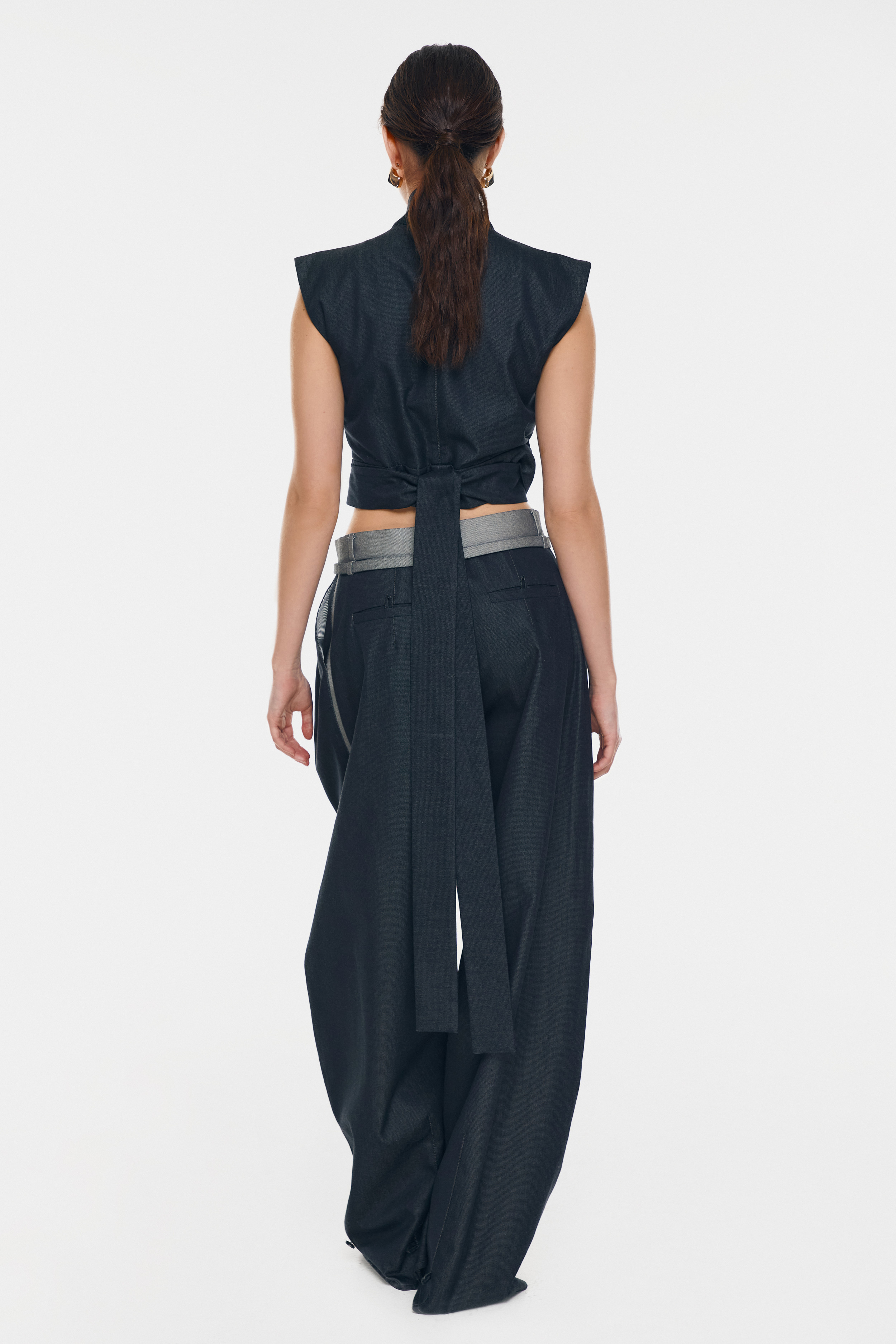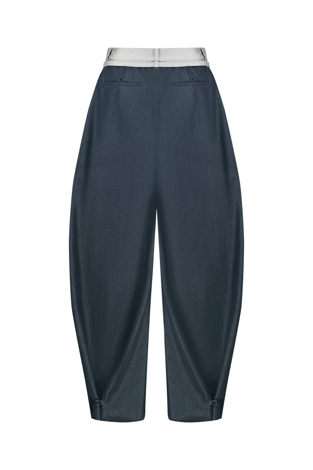 Pantalones anchos de denim con tiro medio y largo extendido. El bajo cuenta con un botón ajustable para jugar con la silueta.