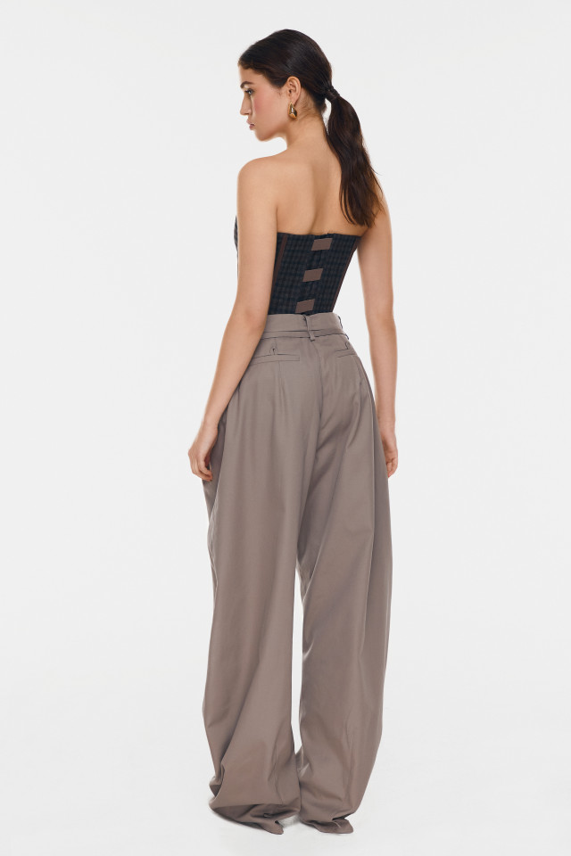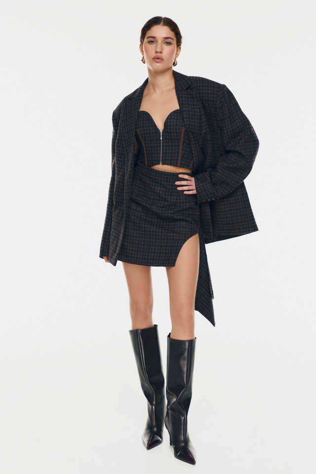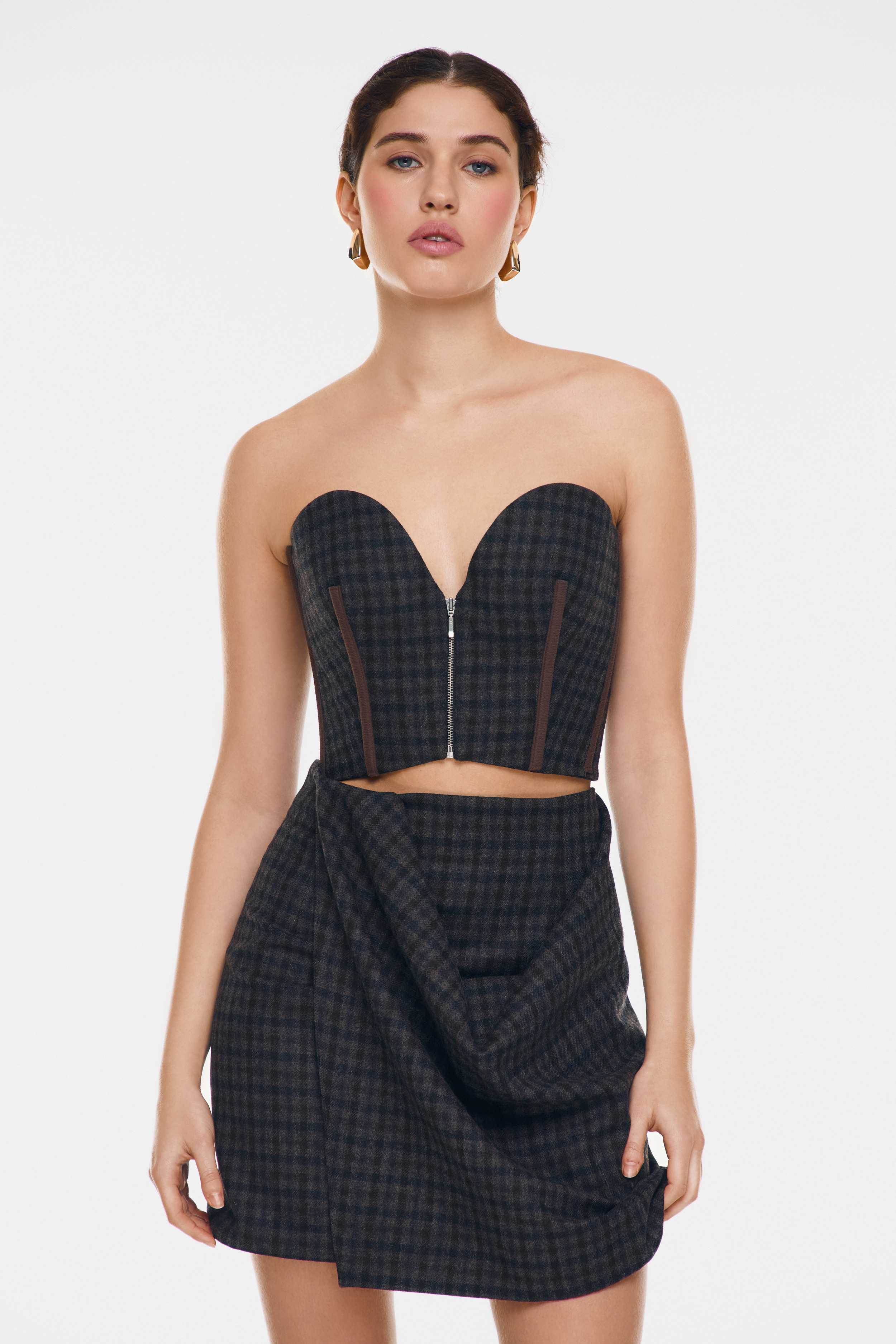 Corsé estructurado con escote curvo en forma de corazón. Confeccionado en lana de cuadros y detalles verticales que estilizan la cintura. Cierre frontal con cremallera metálica. Silueta corta.