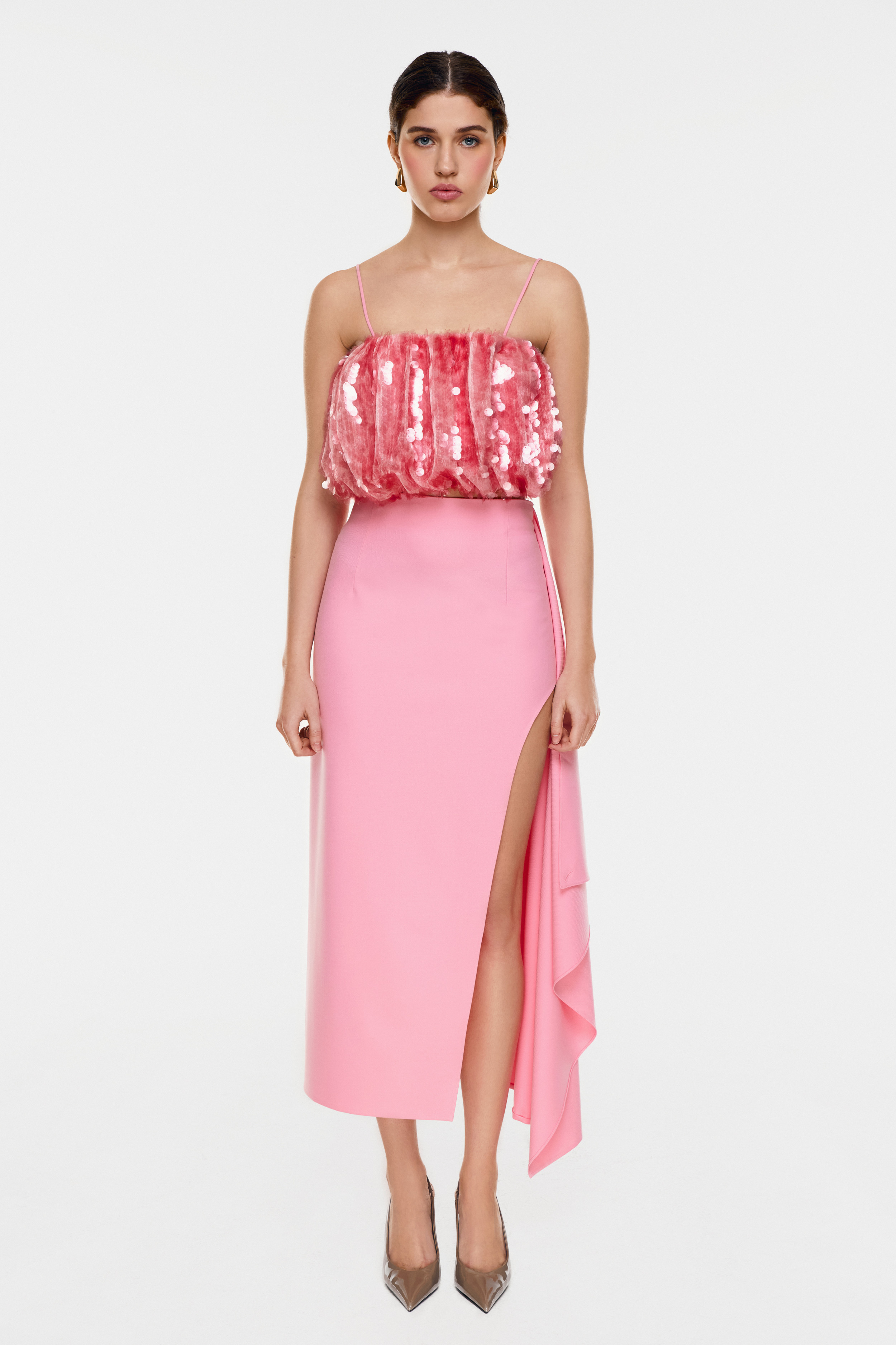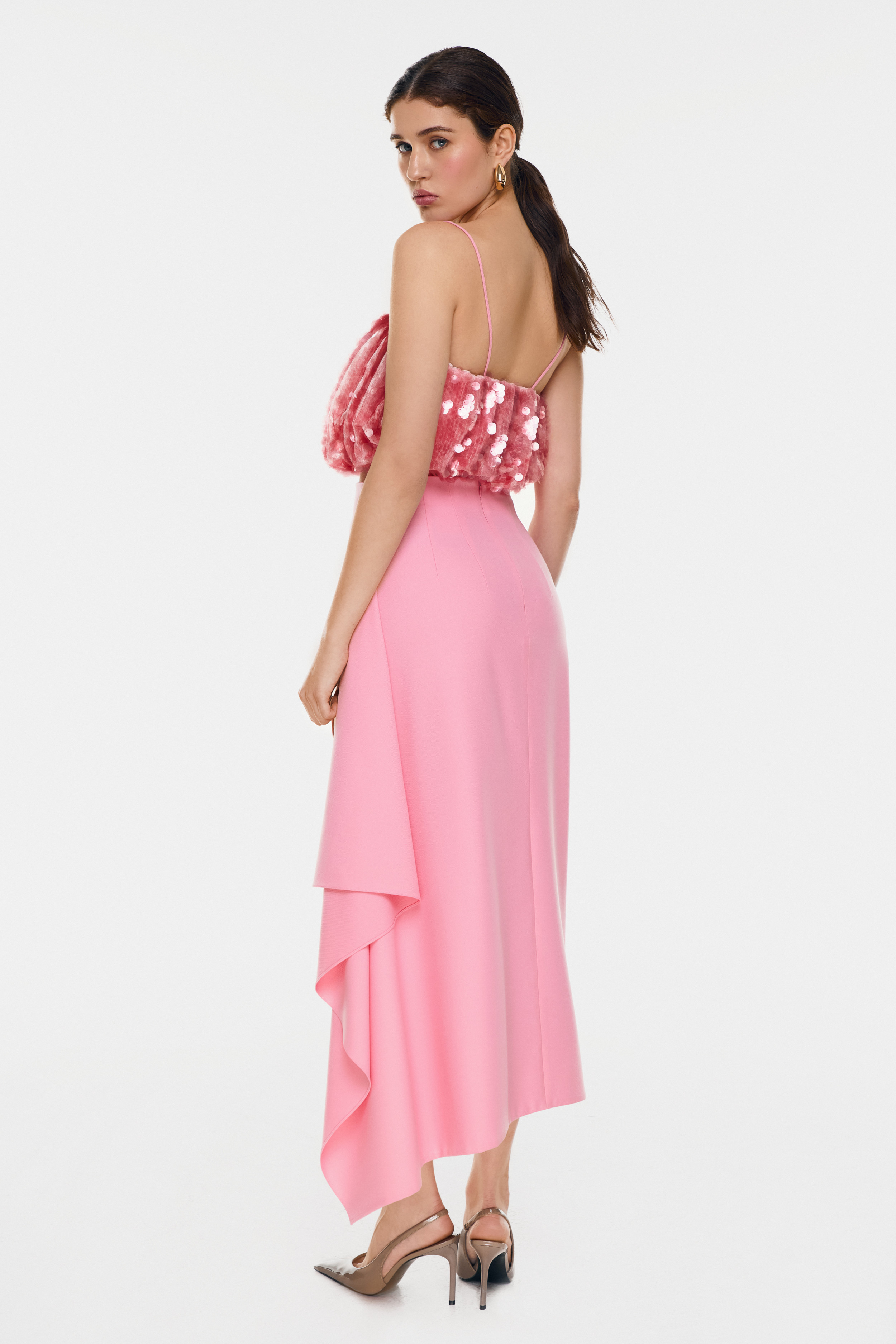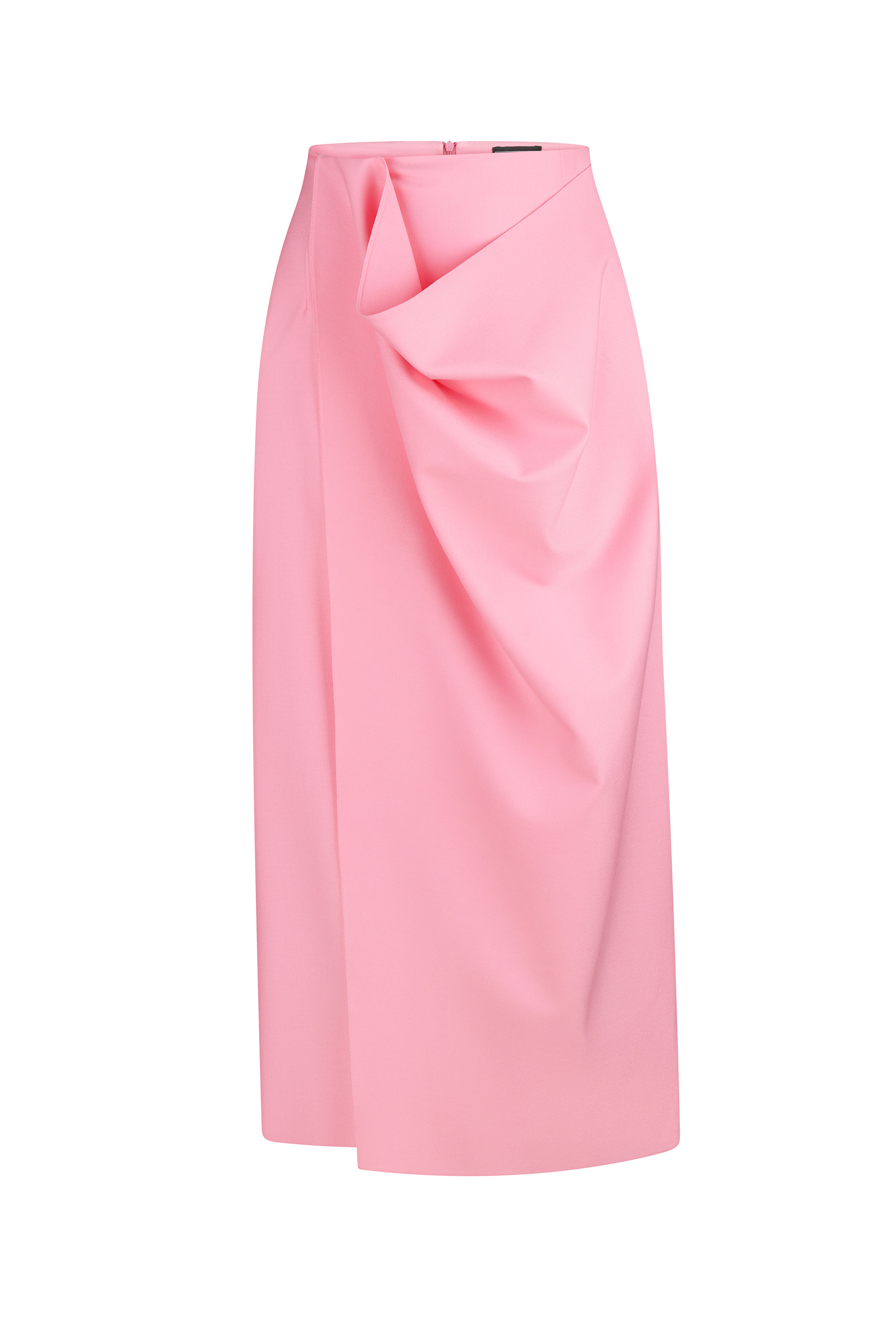 Falda midi de talle alto con abertura lateral pronunciada y cola drapeada asimétrica. Parte trasera recta con cierre de cremallera oculta.