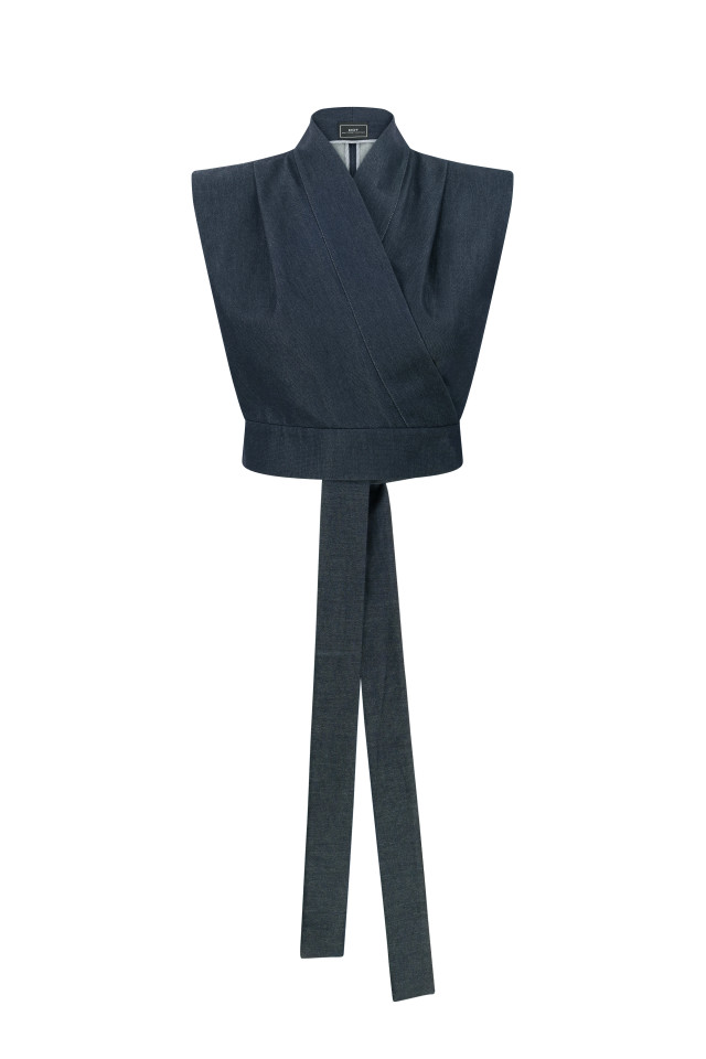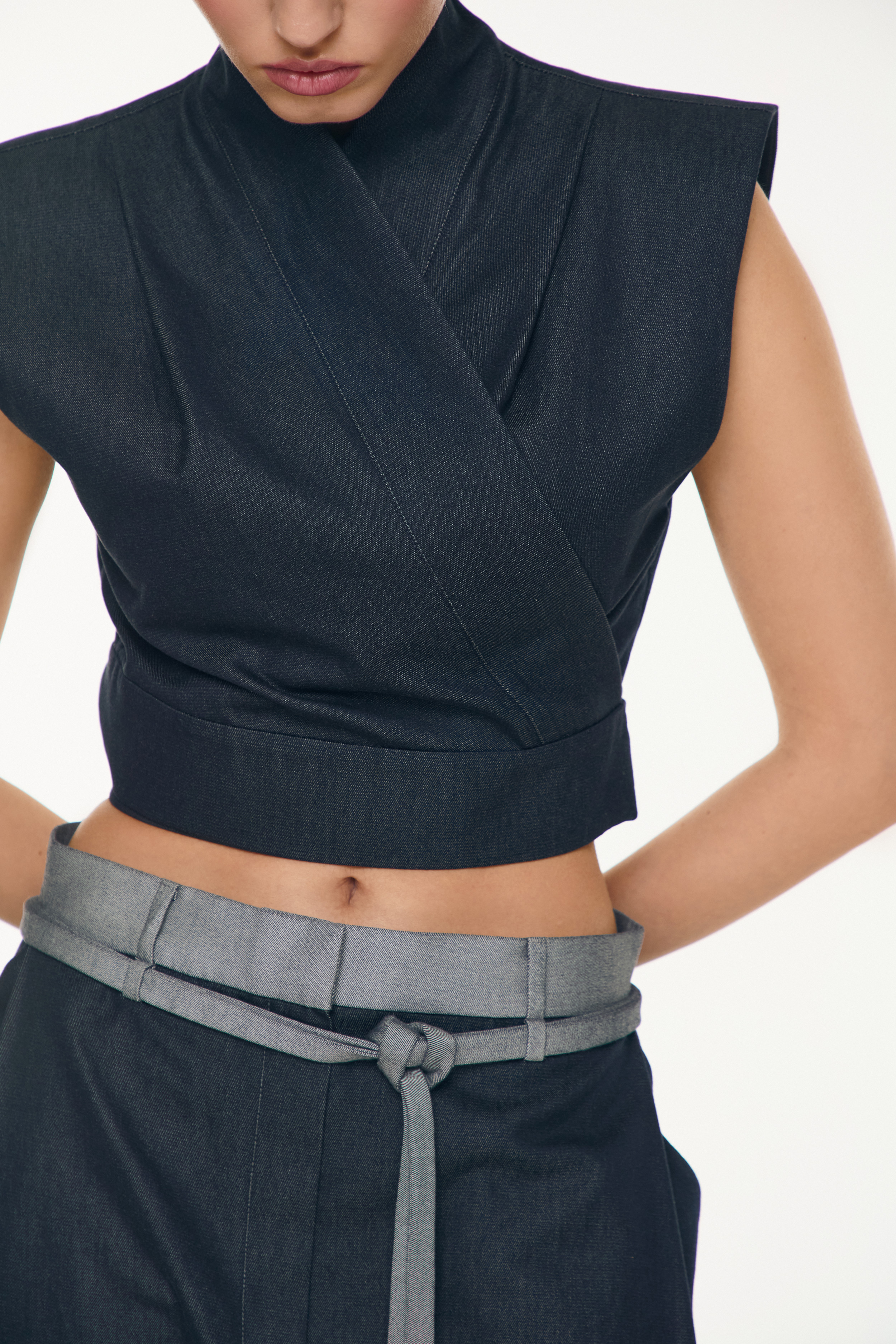Top corto cruzado sin mangas. Los paneles delanteros se cruzan y se anudan en la espalda. Escote y sisas integradas, con la cintura fruncida sobre una banda estructurada.
