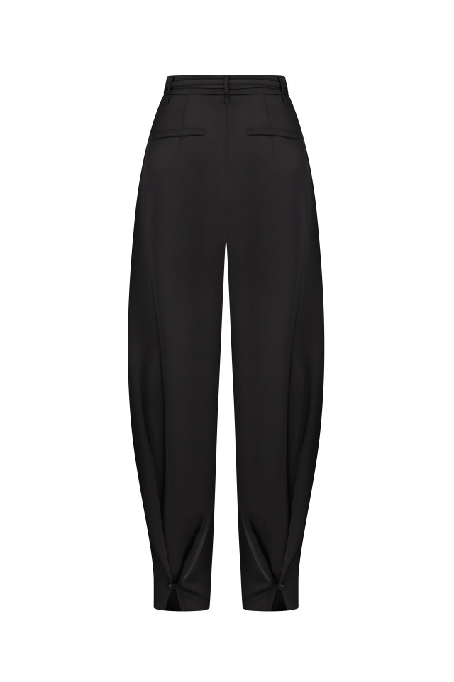 The design features a high waist and a voluminous "barrel" silhouette that broadens at the hips and tapers slightly toward the hem. Soft pleats at the waist provide a comfortable fit and an architectural shape. The waistband includes belt loops and secures with a zipper and a hidden hook.