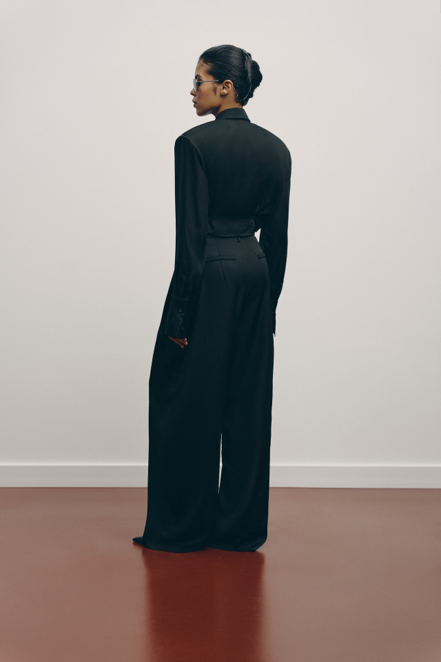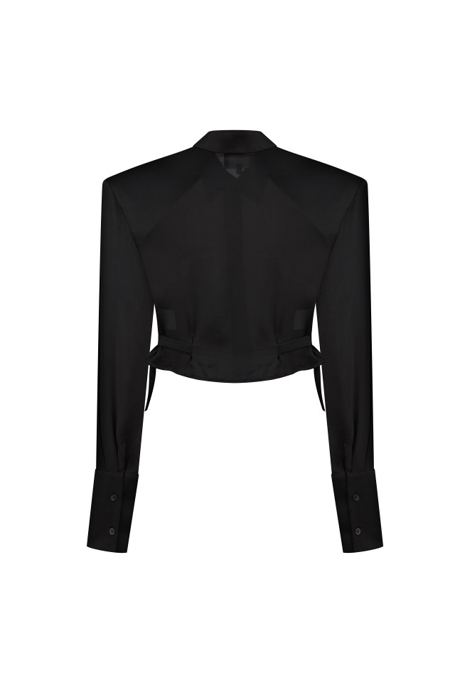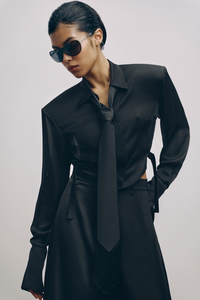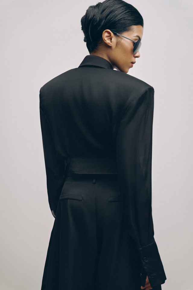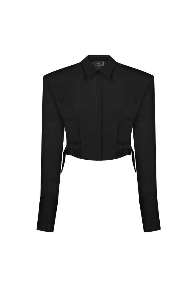 The model features a sharp shoulder line, a classic collar, and elongated cuffs, which together create an elegant and refined silhouette. A unique feature is the side straps, allowing you to subtly emphasize the waist and adjust the fit.