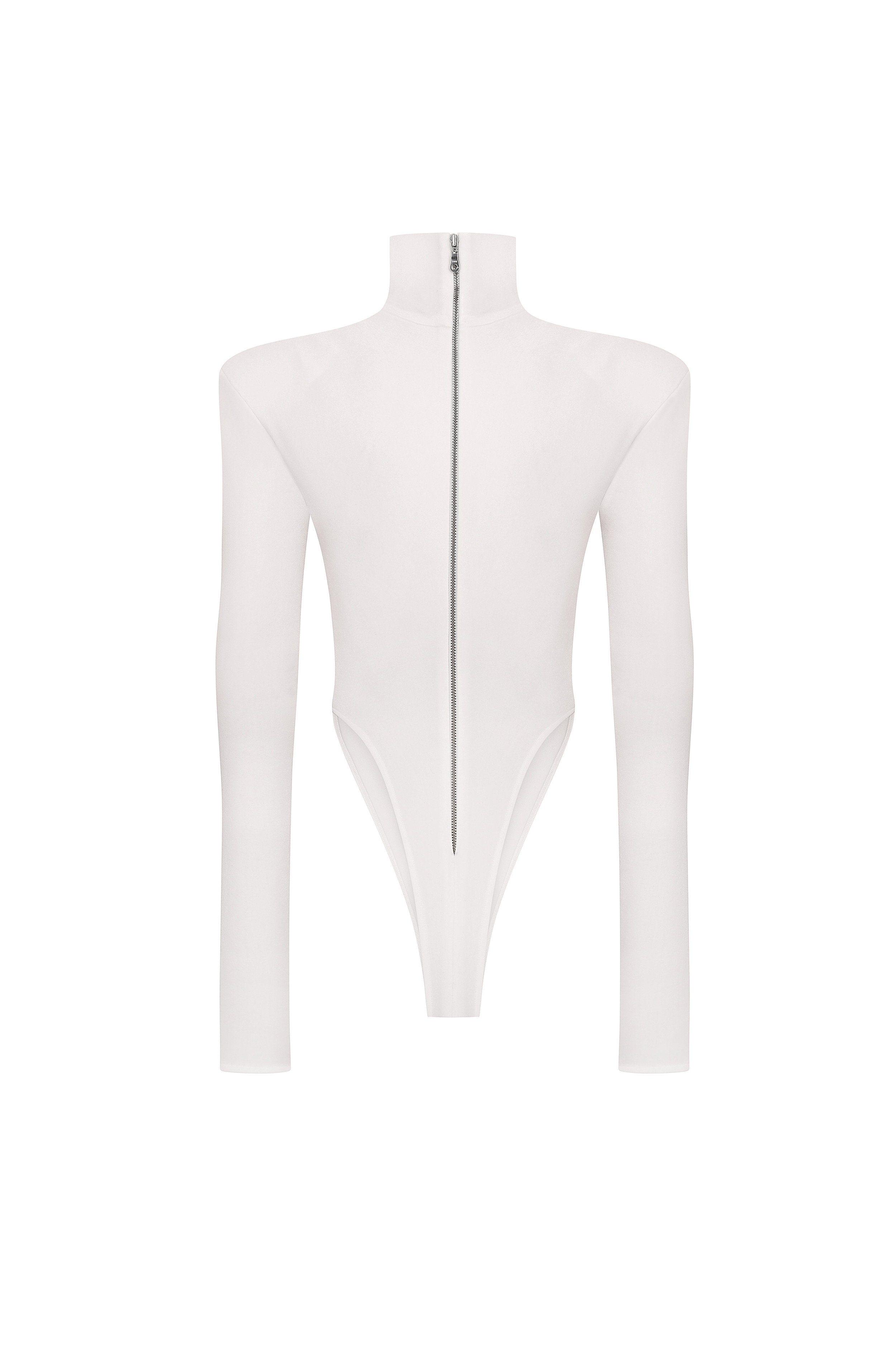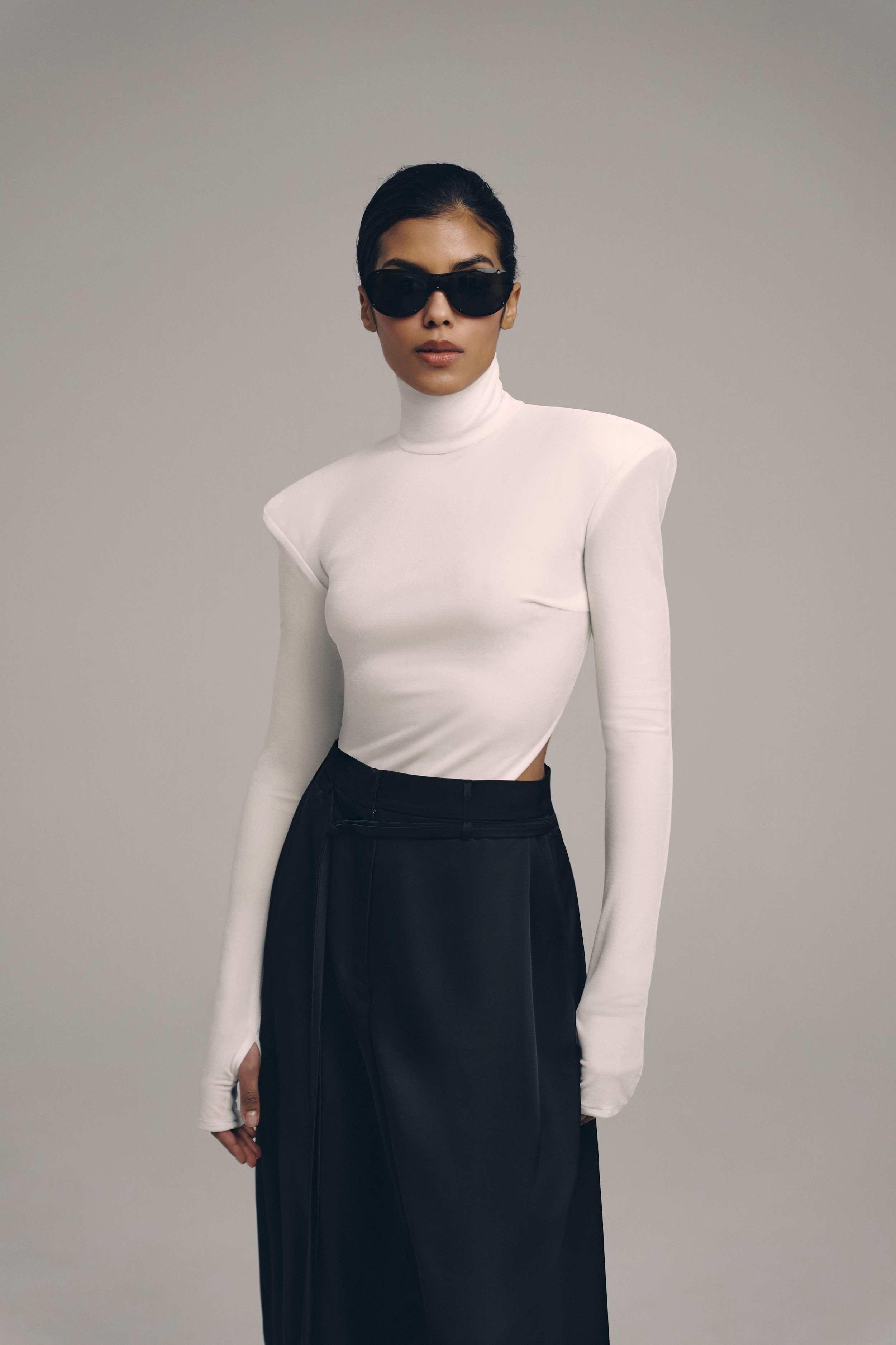 It features a fitted silhouette, a high neck, and long sleeves, creating a "second skin" effect. The design is enhanced with an accented shoulder line, forming a sharp architectural silhouette and adding structure to the look. A hidden zipper is located at the back.